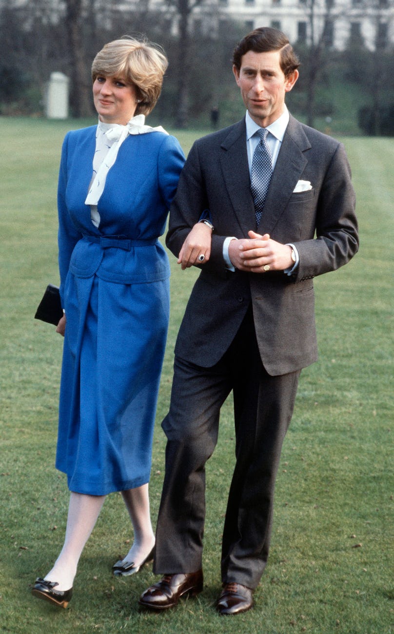 Принцеса Даяна в рокля на Cojana с принц Чарлз в градините на Бъкингамския дворец в деня, в който обявяват годежа си, февруари 1981 г. Снимка: Tim Graham/Getty Images