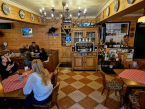 Ресторантът е невероятно уютен с типичния баварски дървен бюфет с богата орнаментика, със старата готварска печка, рисуваните чинии и характерните - все в тоя стил, осветителни тела, с придаващите уют и топлина ламперии, но и с огромните витрини към чудесната романтична уличка.